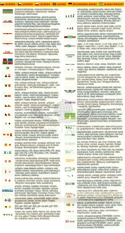 Na mapie widoczne ukształtowanie terenu. Zaznaczono trasy piesze z szacowanymi czasami przejść, a także ścieżki rowerowe z numerami. Legenda w języku: polskim, angielskim, niemieckim, słowackim, czeskim oraz węgierskim.