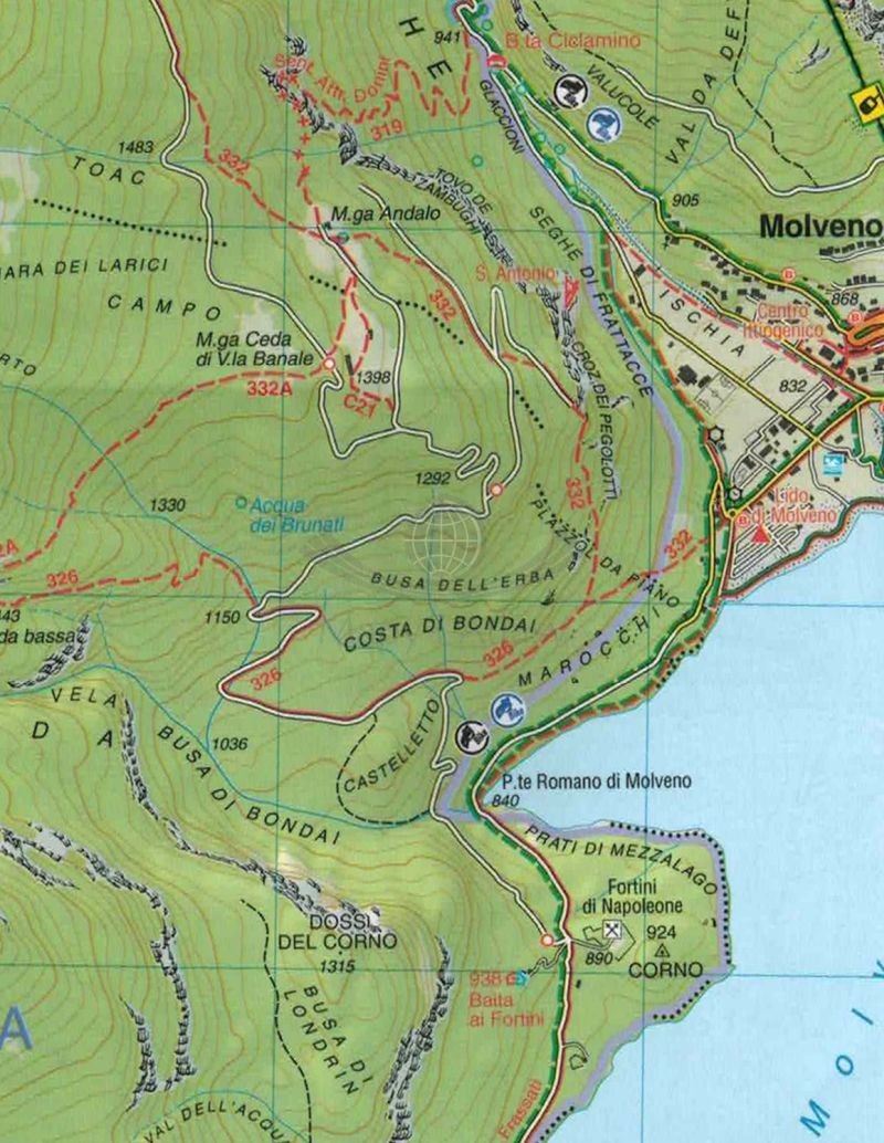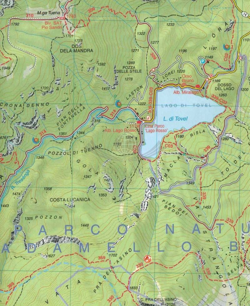 Mapa obejmuje m.in.: Marilleva, Madonna di Campiglio, Pinzolo, Andalo, Molveno, Stenico, S. Lorenzo in Banale, Cma Tosa, Cima Brenta, Pietra Grande, Cima Flavona, Cima Laste.