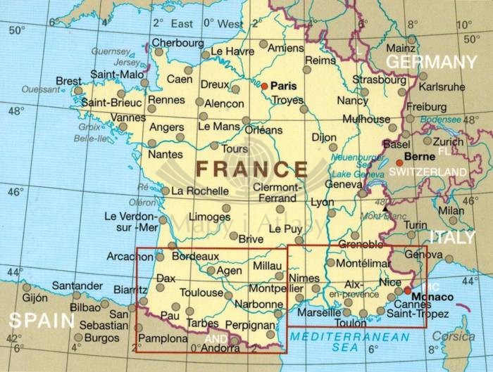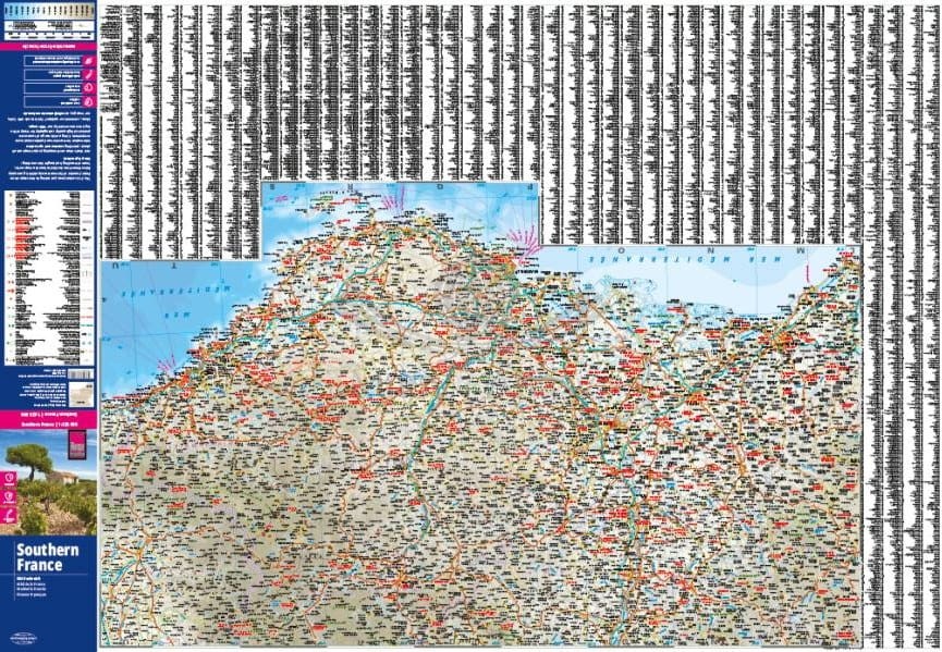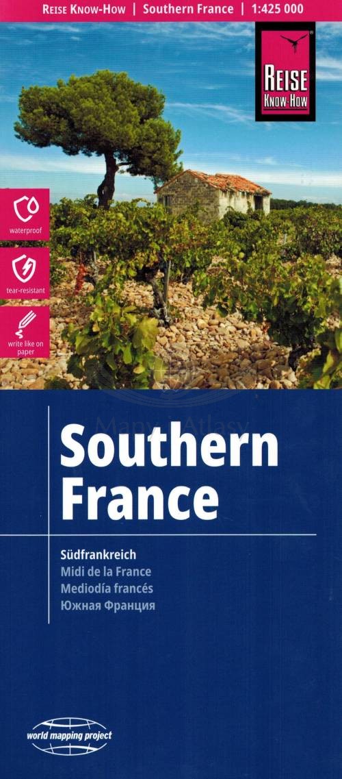 Składana, dwustronna, wodoodporna mapa samochodowo-turystyczna południowej części Francji w skali 1:425 000 wydawnictwa Reise Know-How.