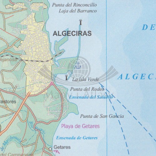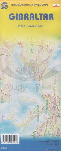 Jednostronna, składana mapa samochodowo-turystyczna Cieśniny Gibraltarskiej w skali 1:80 000, oraz plan miasta Gibraltar w skali 1:10 000. Legenda w języku angielskim oraz hiszpańskim.