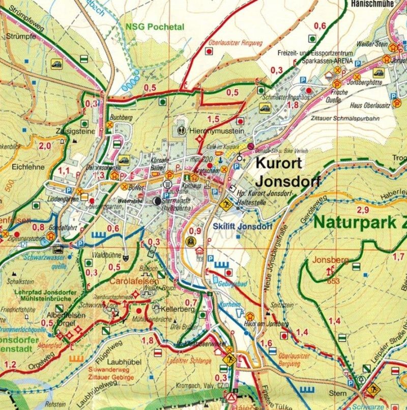 Mapa obejmuje: Krasna Lipa, Varnsdorf, Ceska Kamenice, Novy Bor, Cvikov, Hradek nad Nisou oraz Zittau.
