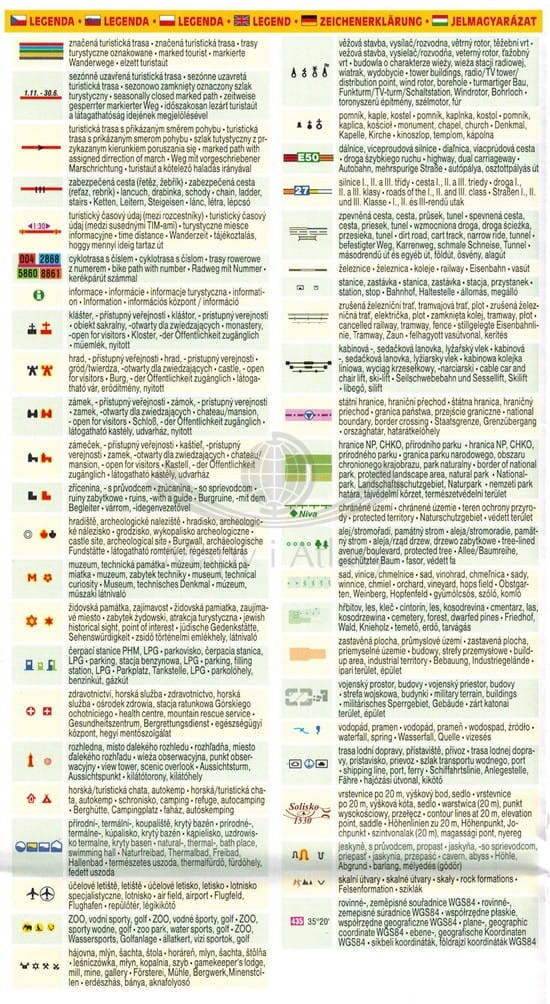 Na mapie widoczne ukształtowanie terenu. Zaznaczono trasy piesze oraz ścieżki rowerowe. Legenda w języku: polskim, angielskim, niemieckim, czeskim, słowackim oraz węgierskim.