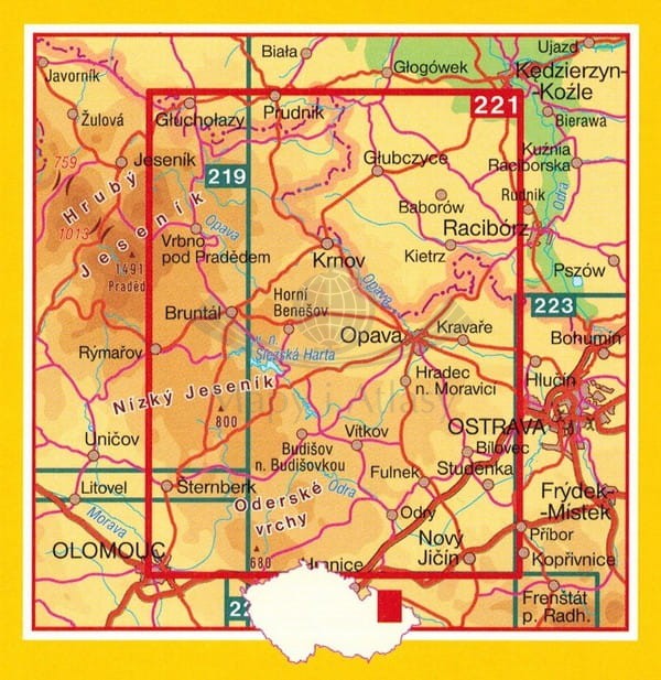 Składana, jednostronna mapa turystyczna Gór Odrzańskich, okolic Opawy i Niskiego Jesionika w skali 1:100 000, czeskiego wydawnictwa Shocart. Zasięg mapy to: Głuchołazy i Prudnik na północy, Kravare i Bilovec na wschodzie, Novy Jicin i Potstat na południu oraz Sternberk, Rymarov i Zlate Hory na zachodzie.