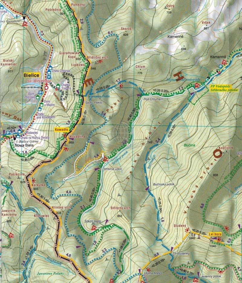 - długości szlaków pieszych w kilometrach, czasy przejść,
