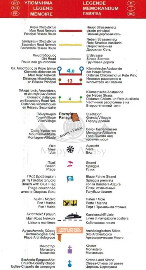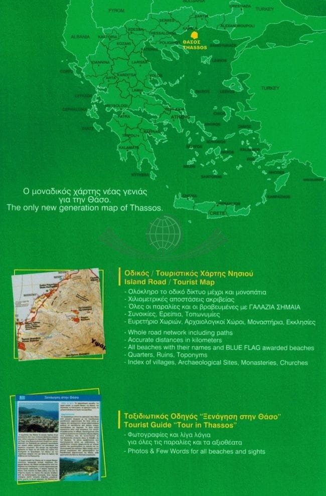 Składana, jednostronna mapa turystyczna greckiej wyspy Tasos w skali 1:45 000 wydawnictwa ORAMA editions.
