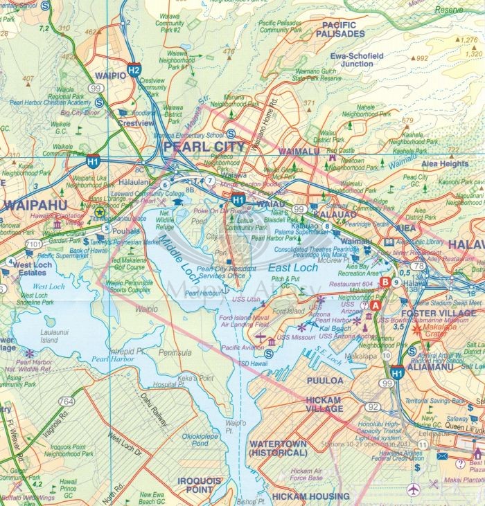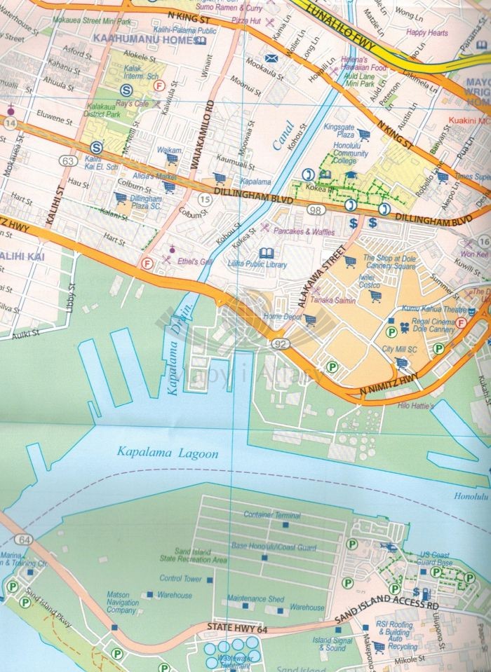 Na jednej stronie publikacji znajduje się mapa całego Oahu, natomiast na drugiej plan miasta Honolulu.