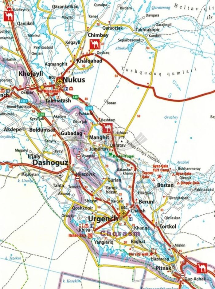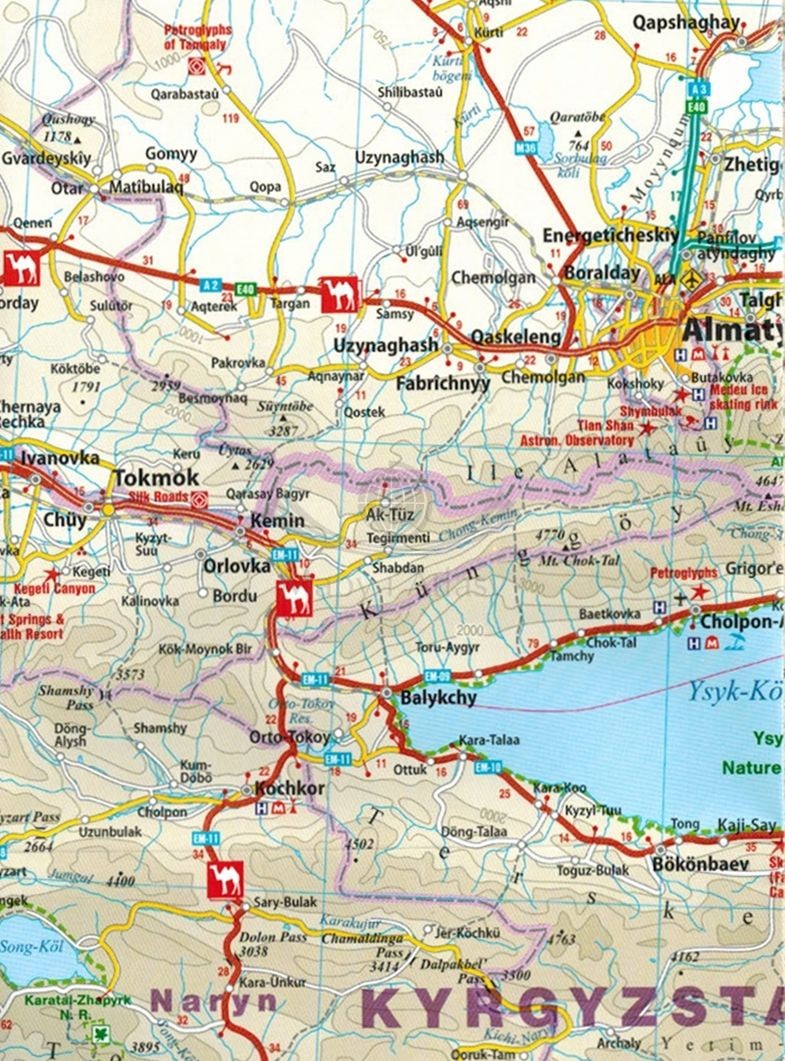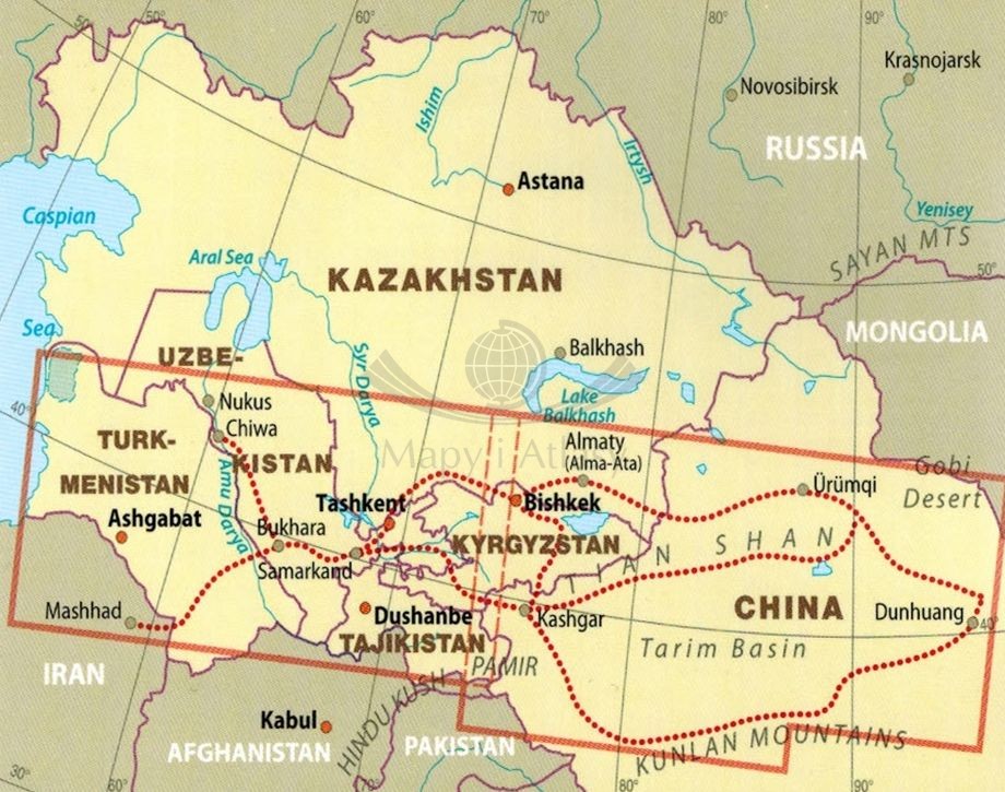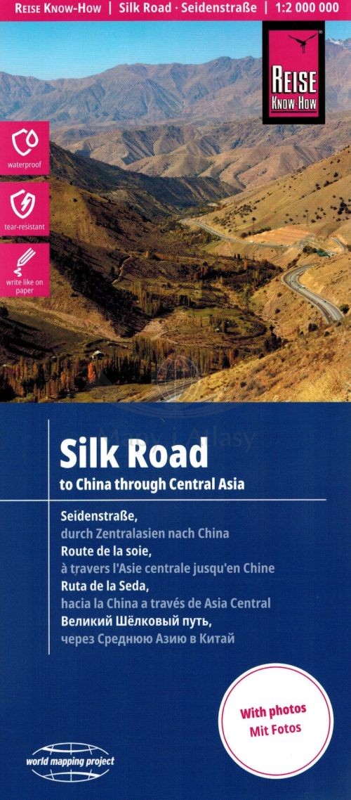 Składana, dwustronna, wodoodporna mapa samochodowo-turystyczna Jedwabnego Szlaku w skali 1:2 000 000 wydawnictwa Reise Know-How.