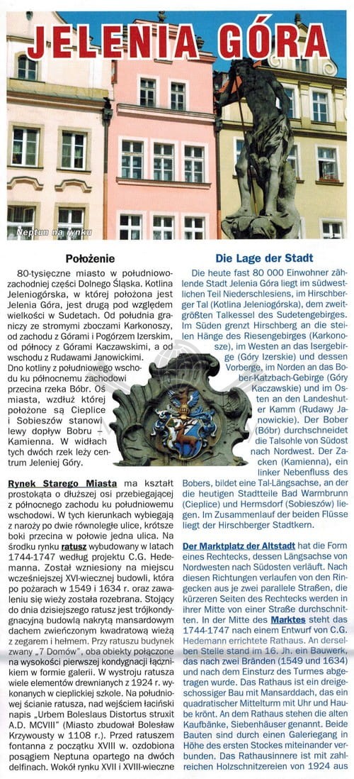 Aktualizowany w terenie, składany plan miasta Jeleniej Góry i Piechowic z dokładną numeracją budynków. Na rewersie krajoznawczy opis ze zdjęciami najważniejszych atrakcji w mieście.