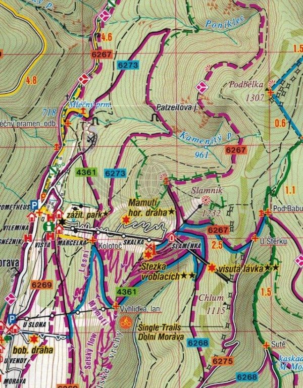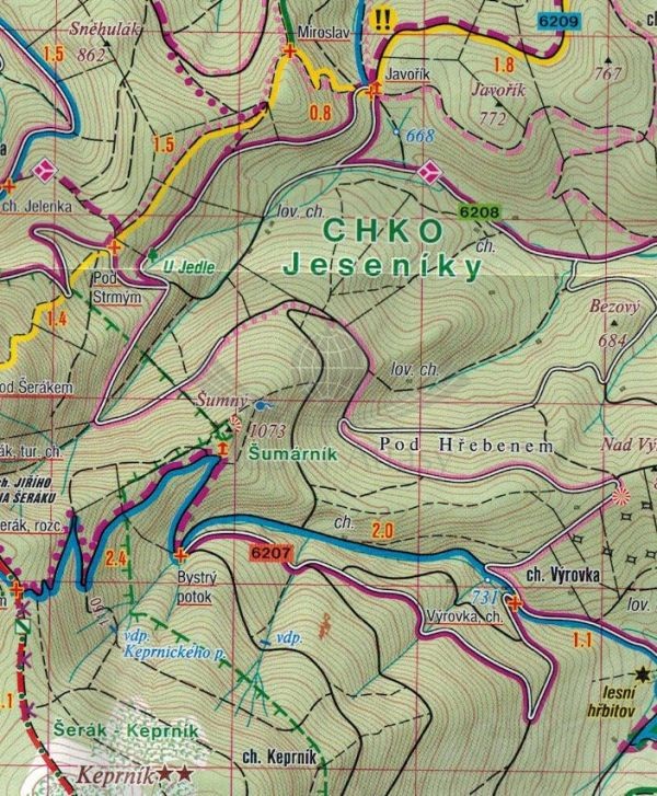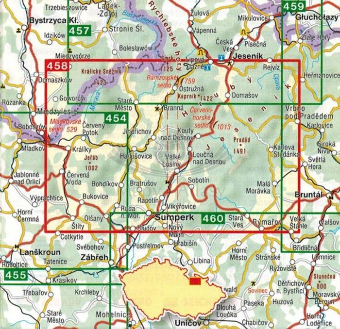 Obejmuje szczyt Pradziad oraz Kralicki Śnieżnik. Zasięg mapy to: Kralicki Śnieżnik i Jesenik na północy, Vrbno pod Pradedem i Karlova Studanka na wschodzie, Rymarov, Sumperk i Stity na południu oraz Cervena Voda i Goworów na zachodzie.