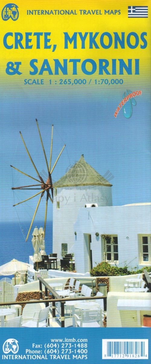 Składana, dwustronna, wodoodporna mapa samochodowa Krety w skali 1:265 000 oraz Mykonos i Santorini w skali 1:70 000 wydawnictwa ITMB.