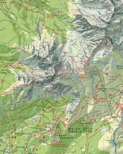 Składana, jednostronna mapa turystyczna Meran i okolic w skali 1:25 000. Obejmuje: Texelgruppe/Gruppo di Tessa, Naturnser Hochwart/Guardia Alta, Hirzer Sp./P. Cervina.