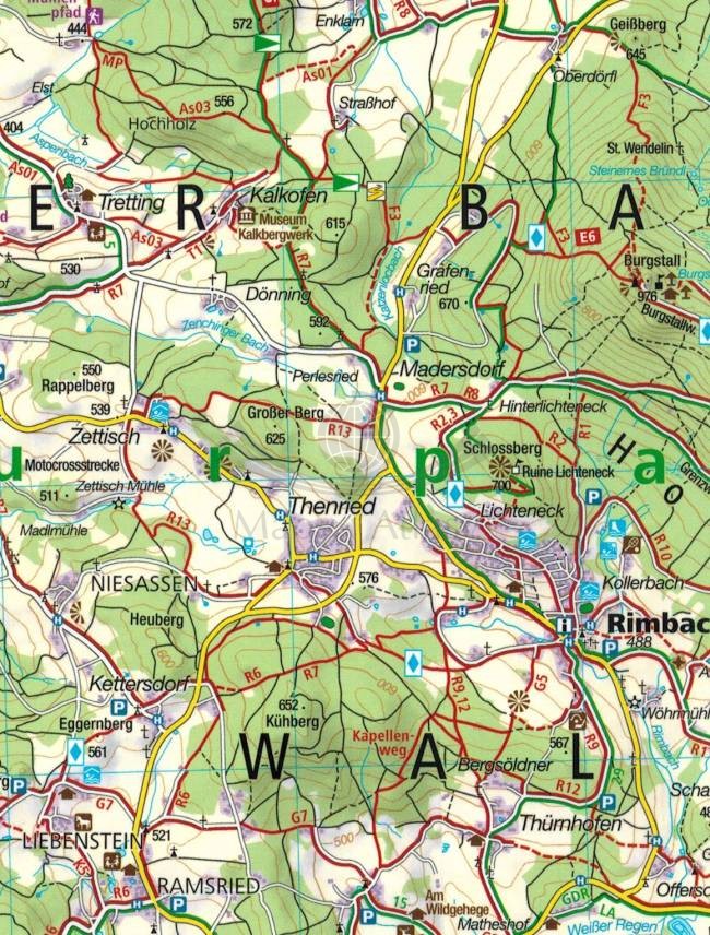 Składana, jednostronna, wodoodporna mapa turystyczna północnej części Lasu Bawarskiego w skali 1:50 000 wydawnictwa Kompass.