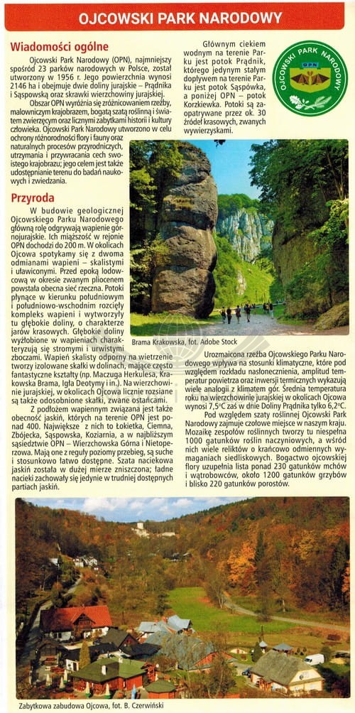 Ojcowski Park Narodowy jest najmniejszym spośród 23 parków narodowych w Polsce. Wyróżnia się zróżnicowaniem rzeźby terenu, malowniczym krajobrazem, bogatą szatą roślinną i światem zwierzęcym oraz licznymi zabytkami historii i kultury. Jest to teren idealny na piesze i rowerowe wycieczki.