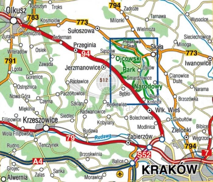 Mapa prezentuje obszar od Sułoszowej na północy po Biały Kościół na południu oraz od Sąspowa na zachodzie do Skały na wschodzie.