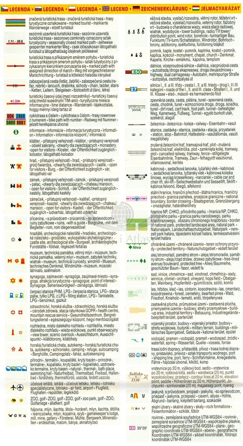 Na mapie widoczne ukształtowanie terenu. Zaznaczono trasy piesze, a także ścieżki rowerowe z numerami. Legenda w języku: polskim, angielskim, niemieckim, czeskim, słowackim oraz węgierskim.