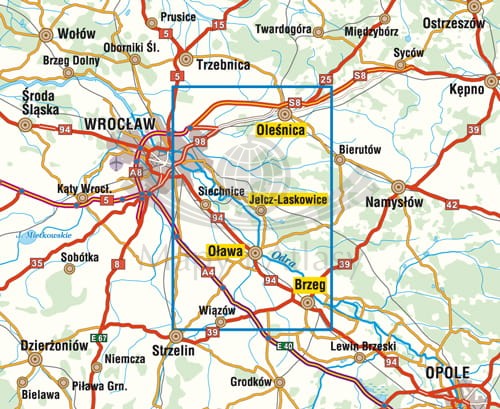 Na zachodzie mapa sięga po centrum Wrocławia, na wschodzie do Brzegu, południowa granica określona jest przez Wiązów, północna przez Oleśnicę...