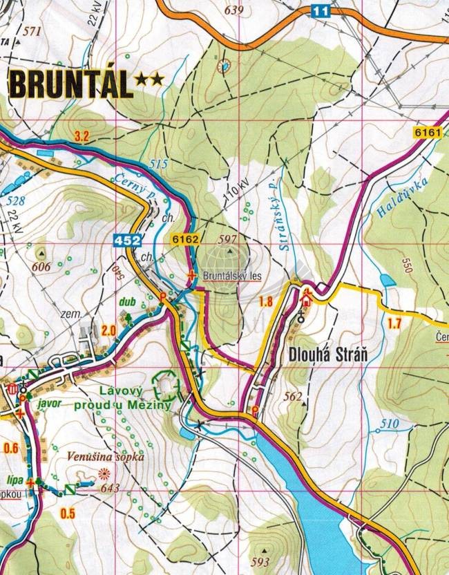 Zasięg mapy to: Bruntal, Lichnov, Pilszcz i Koberice na północy, Kravare, Stitina, Hrabyne, Pusta Polom, Vyskovice, Bilovec i Studenka na wschodzie, Fulnek, Klokocov i Domasov na południu oraz Horni Lodenice, Detrichov nad Bystrici, Lomnice i Valsov na zachodzie.
