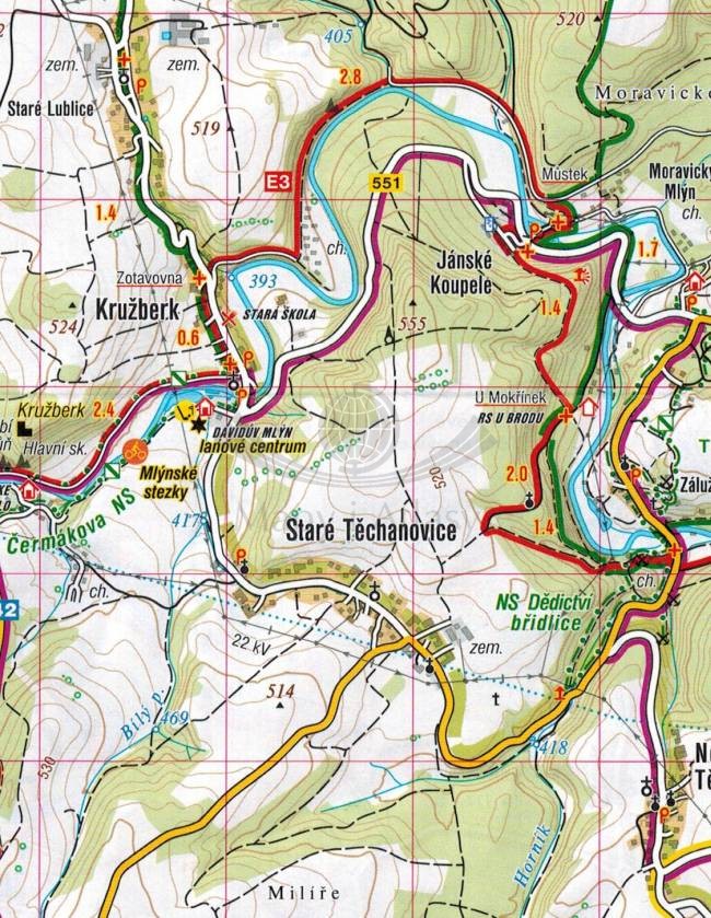 Na mapie widoczne ukształtowanie terenu. Zaznaczono szlaki piesze i rowerowe. Odległości podano w kilometrach. Legenda również w języku polskim.