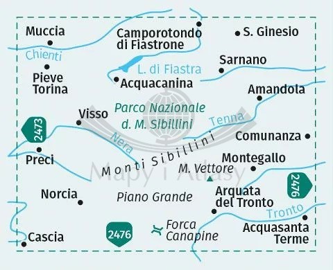 Składana, jednostronna, wodoodporna mapa turystyczna Parku Narodowego Monti Sibillini w skali 1:50 000 wydawnictwa Kompass.