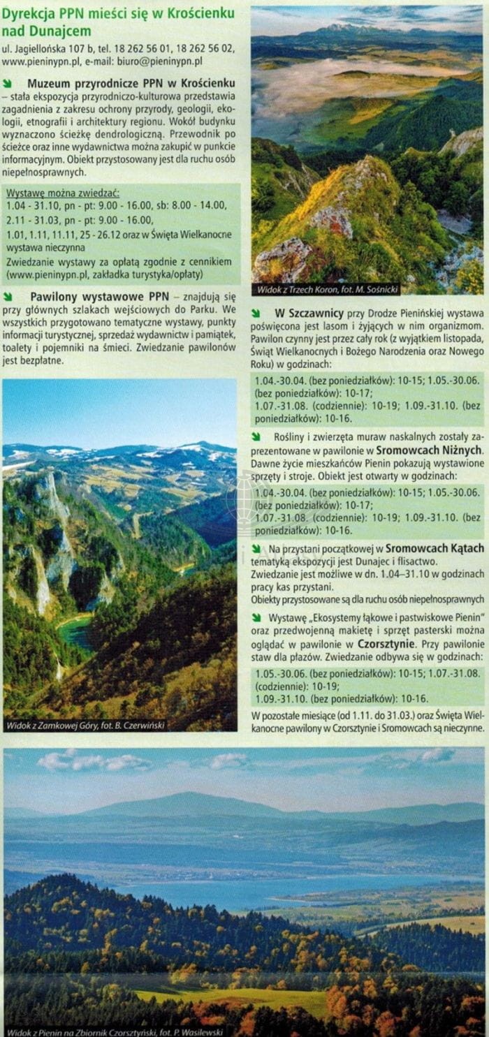 W części informacyjnej znajdują się ciekawostki i opisy najciekawszych atrakcji turystycznych Pienin, propozycje wycieczek oraz informacje praktyczne.