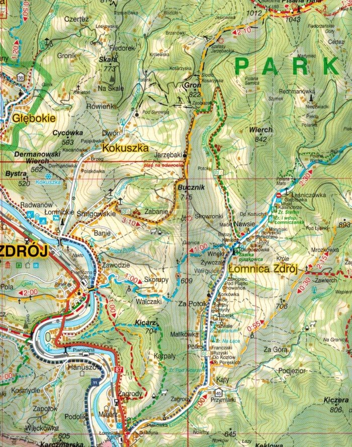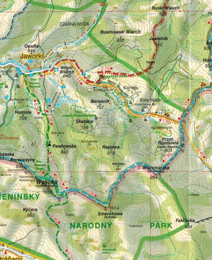 Na odwrocie znajduje się fragment mapy turystycznej "Beskid Sądecki" w skali 1:50 000, z zaznaczonymi szlakami o charakterze lokalnym, szlaki narciarskie, rowerowe, konne. Zaznaczone są granice Popradzkiego Parku Krajobrazowego.