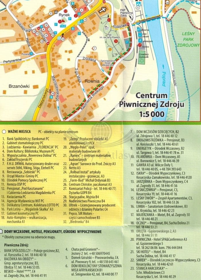 Na jednej stronie arkusza znajduje się mapa Piwnicznej Zdrój i Rytra w skali 1:15 000 oraz zbliżenie centrum miasta w skali 1:5 000, na którym umieszczono ważniejsze ulice i miejsca. Poniżej zamieszczono wybraną bazę noclegową, zdjęcia z malowniczych i ciekawych miejsc oraz krótką charakterystykę tego terenu i panoramę widokową 360° z wieży na Eliaszówce.