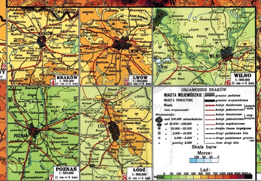 Autorzy umieścili mapy poboczne w skalach 1:500 000. W lewym górnym rogu okolice "Gdańsk i Gdynia", a w lewym dolnym: "Warszawa", "Okręg węglowy", "Kraków", "Lwów", "Wilno", "Tatry", "Poznań" i "Łódź". Całość zamyka karton legendy mapy.
