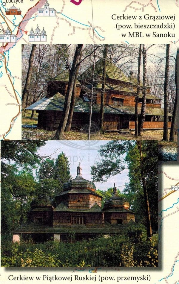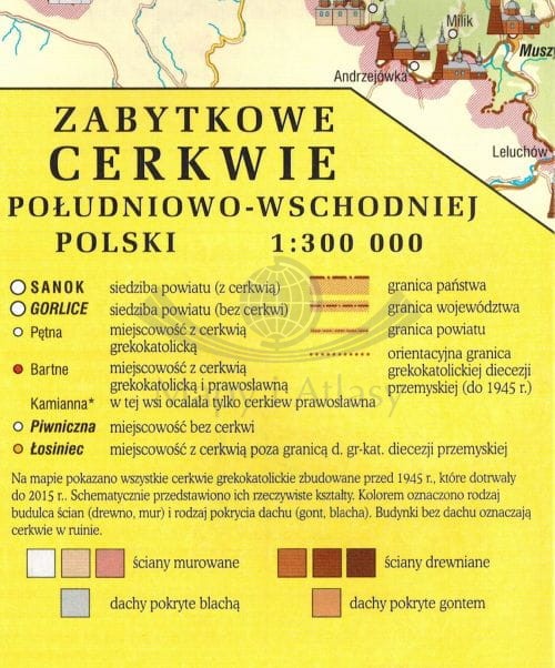 Na mapę naniesiono wyobrażenia poszczególnych obiektów. Cerkwie drewniane zaznaczono na brązowo, blachę na szaro, a murowane na biało, dzięki czemu w sposób jasny i przejrzysty można się zorientować, gdzie znajdują się skupiska zabytkowych obiektów i jakiego są one rodzaju.