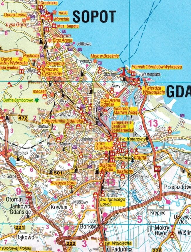 Składana mapa samochodowo-turystyczna Pomorza Gdańskiego w skali 1:160 000 wydawnictwa Galileos w wersji dwujęzycznej (polsko-niemieckiej).