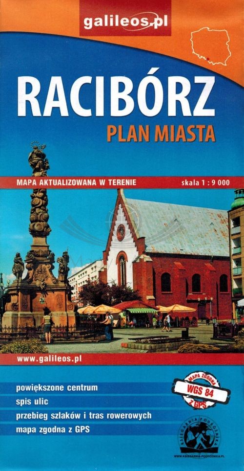Składany plan miasta Raciborza w skali 1:9 000 z mapą turystyczną powiatu raciborskiego w skali 1:50 000 wydawnictwa Galileos.