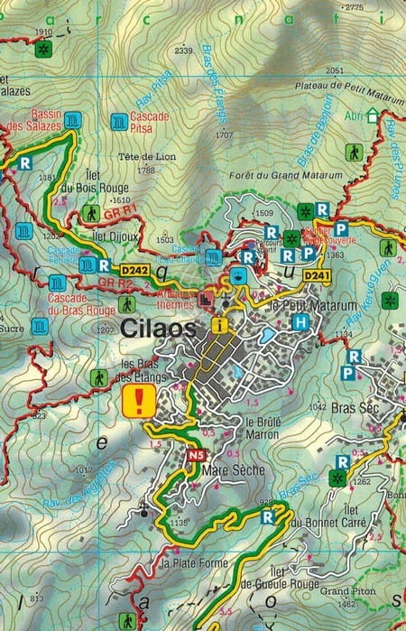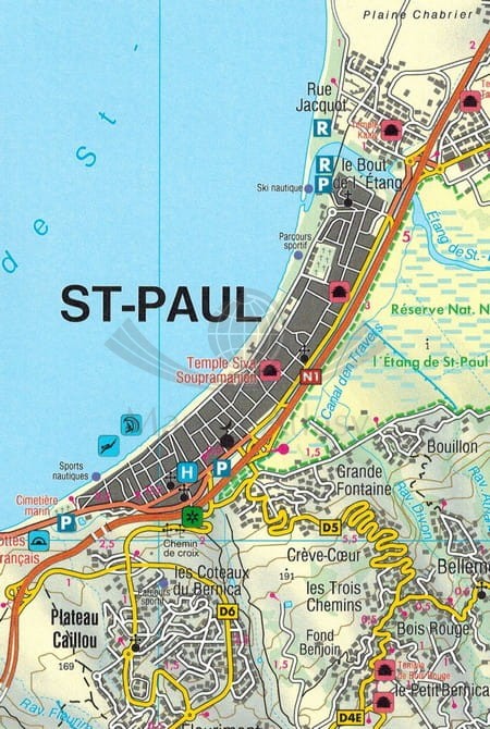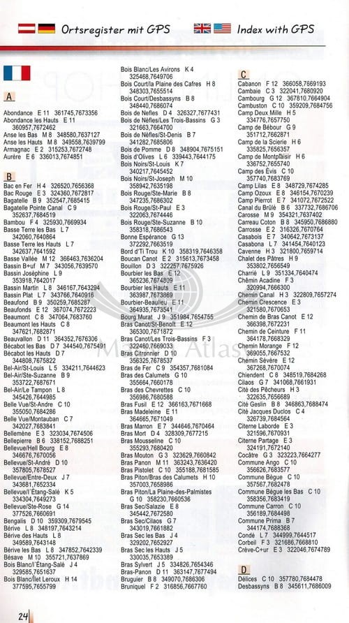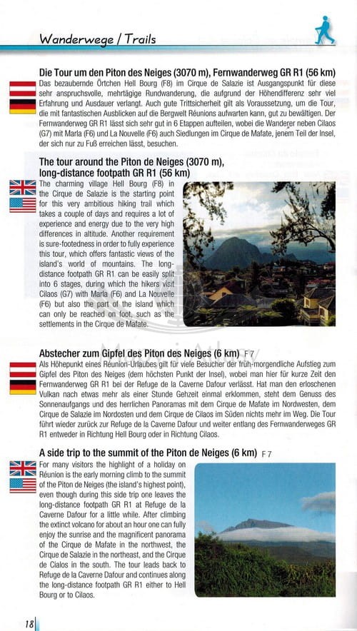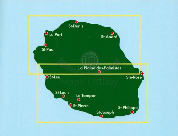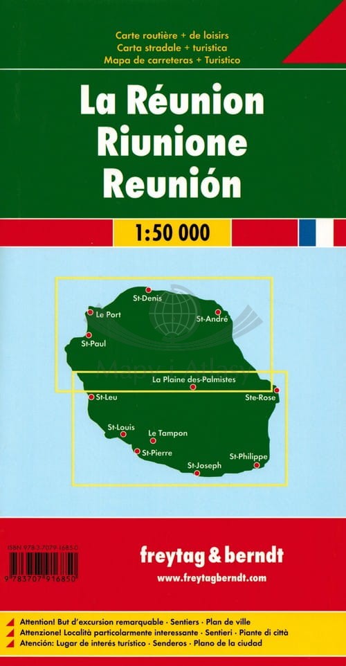 Składana, dwustronna mapa samochodowo-turystyczna wyspy Reunion położonej na Oceanie Indyjskim w skali 1:50 000. Legenda w języku: angielskim, niemieckim, francuskim, włoskim, hiszpańskim oraz holenderskim.