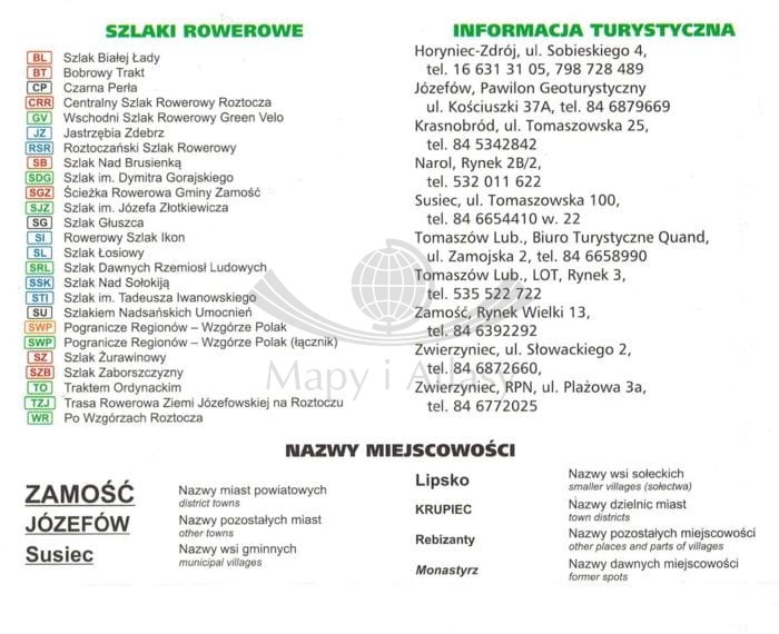 Mapa obejmuje następujące miasta: Adamów, Bełżec, Cieszanów, Horyniec-Zdrój, Józefów, Krasnobród, Lubycza Królewska, Narol, Susiec, Szczebrzeszyn, Tomaszów Lubelski i Zwierzyniec.