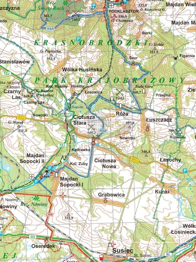 - punkty widokowe, numery oddziałów leśnych, leśniczówki.