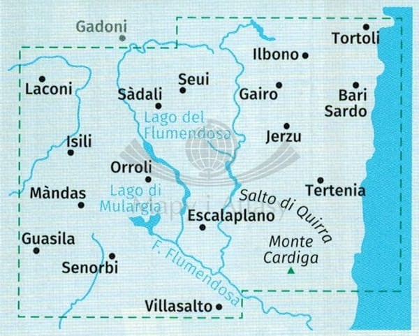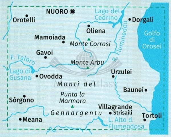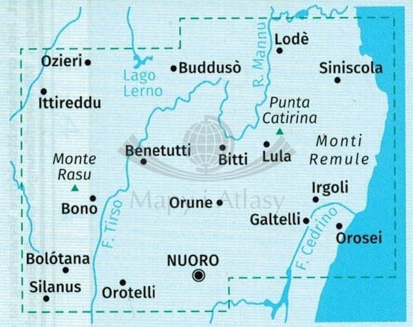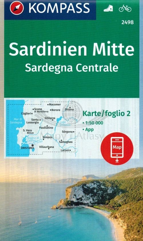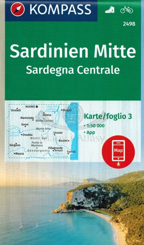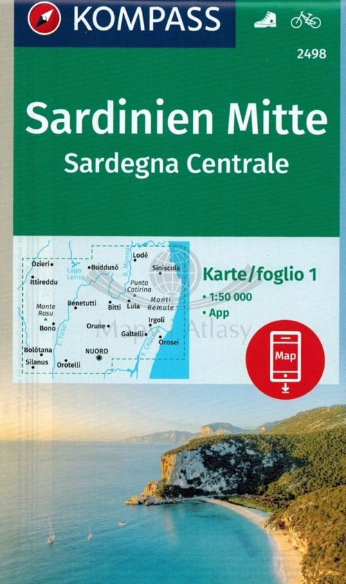 Zestaw czterech, składanych, dwustronnych map turystycznych Sardynii Środkowej w skali 1:50 000 wydawnictwa Kompass.