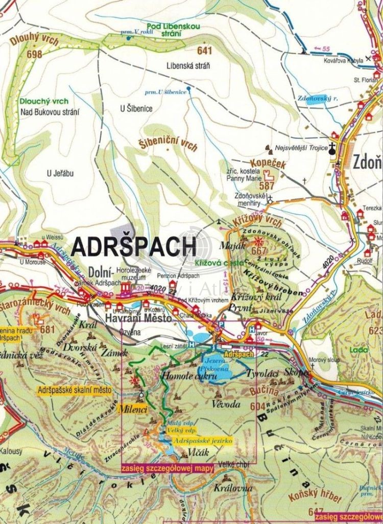 Mapa główna w skali 1:35 000 obejmuje obszar Aderszpaskich i Teplickich skał wraz z okolicami. Zasięg tej mapy obejmuje również Mieroszów i Chełmsko Śląskie, co szczególnie ułatwia dotarcie w ten rejon osobom przybywającym z okolic Jeleniej Góry i Wałbrzycha.