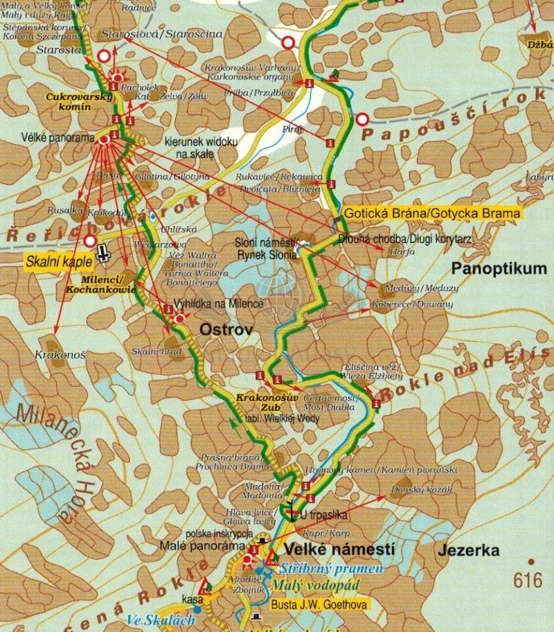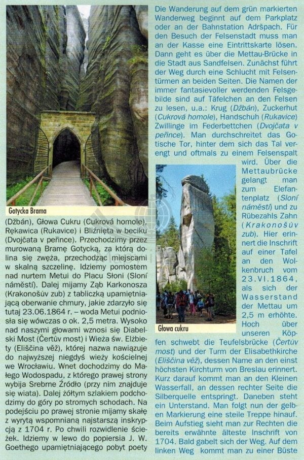 Publikacja zawiera szczegółowe schematy każdego ze Skalnych Miast wraz z prowadzącymi przez nie trasami turystycznymi: