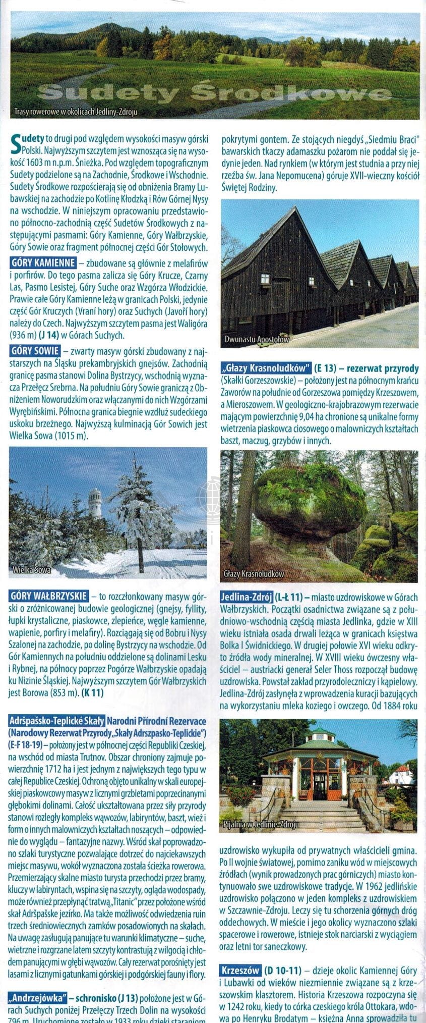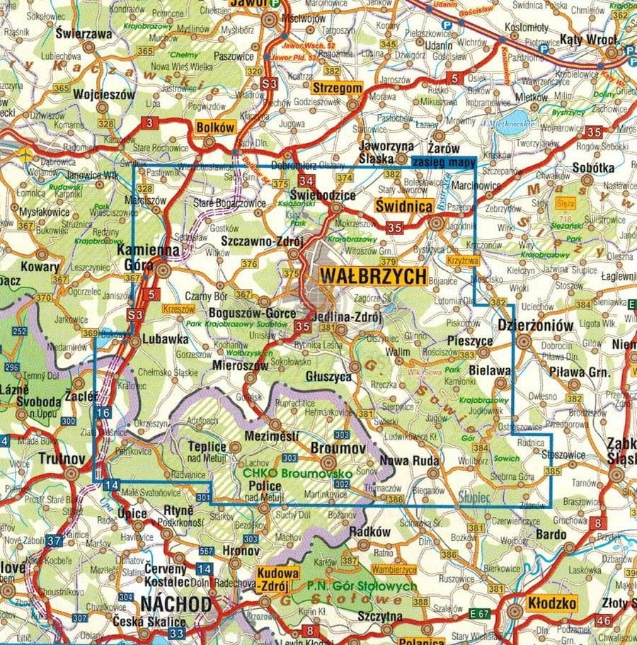 Mapa obejmuje m.in. Góry Sowie, Góry i Pogórze Wałbrzyskie, Góry Kamienne oraz dużą część Broumovskiej Vrchoviny ze skalnymi miastami Aderszpasko Teplickich Skał włącznie.