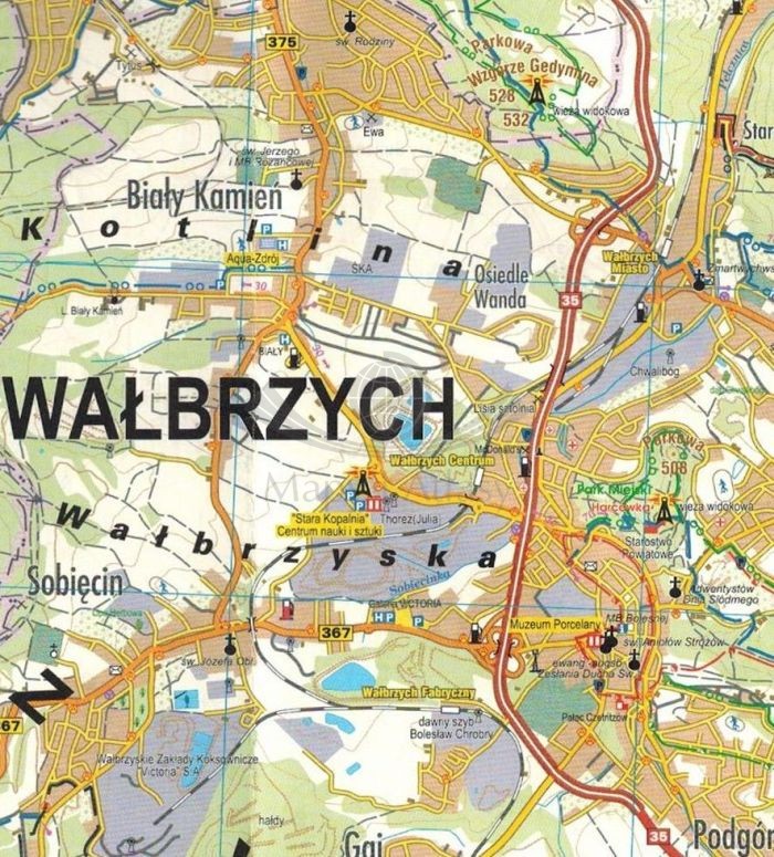 Dodatkowo na mapie kolorem żółtym wyszczególniono atrakcje turystyczne.