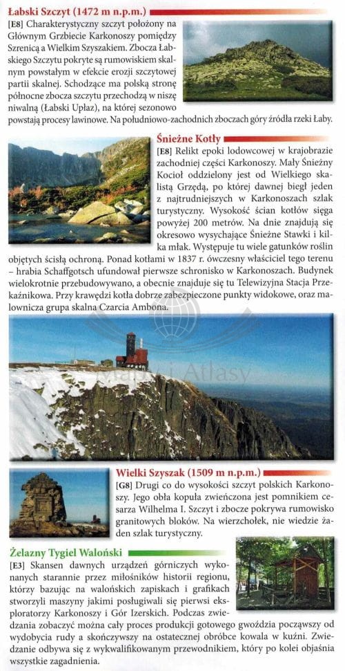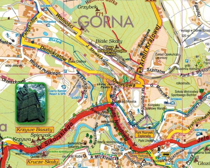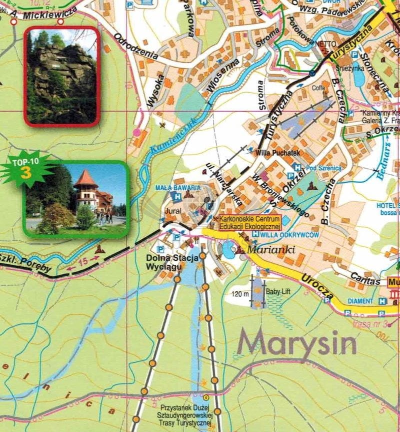 Mapa idealna dla turystów, którzy podczas pobytu w Szklarskiej Porębie chcą wędrować po najbliższej okolicy miasta z Karkonoszami włącznie. Na mapie zaznaczono dodatkowo najważniejsze atrakcje turystyczne, które zostały podzielone na łatwo dostępne (Wygodnie) oraz trudno dostępne (Aktywnie).