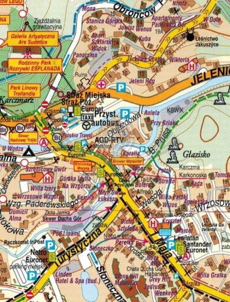 Składany plan miasta Szklarskiej Poręby w skali 1:9 000 wraz z mapą okolic w skali 1:25 000 wydawnictwa Libra.