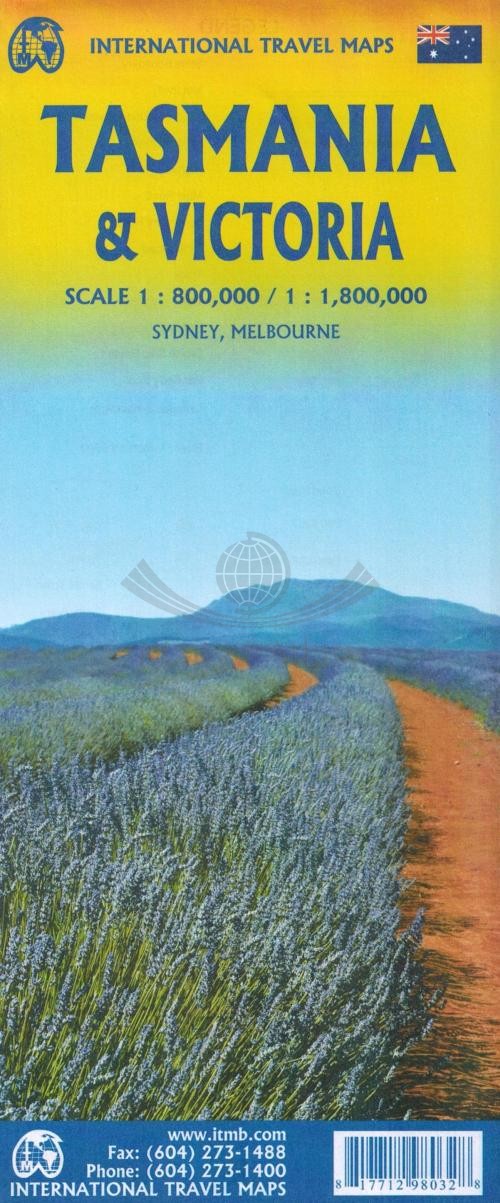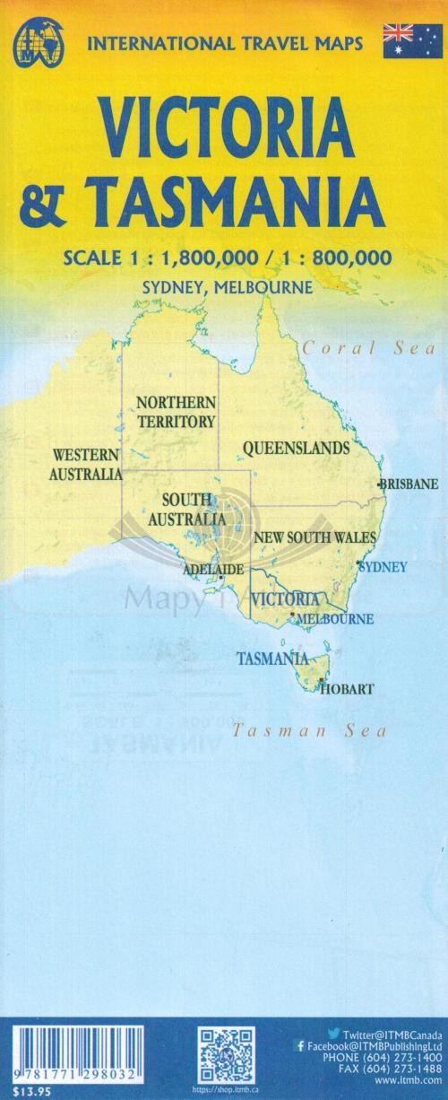 Składana, dwustronna mapa samochodowo-turystyczna Tasmanii w skali 1:800 000 i stanu Victoria w Australii w skali 1:1 800 000 wydawnictwa ITMB.