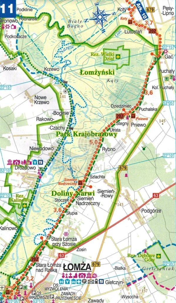 - trasę rowerową Green Velo, odległości podane w kilometrach,