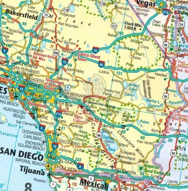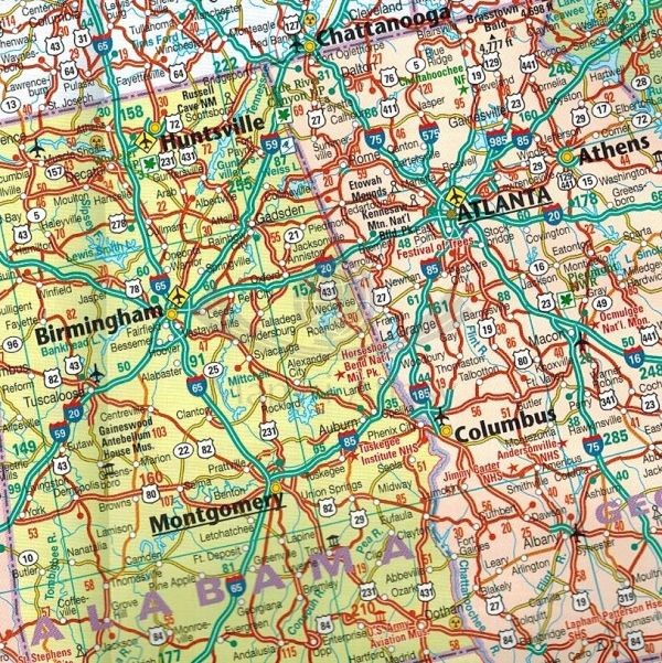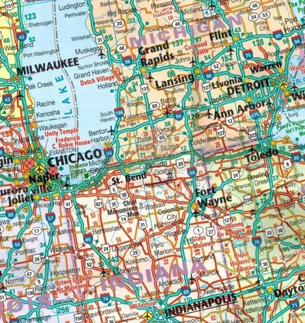 - sieć dróg wraz z numerami, odległości podane w milach,
