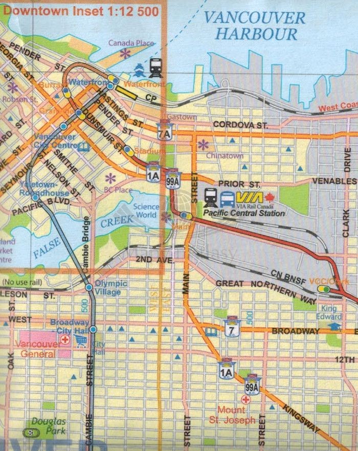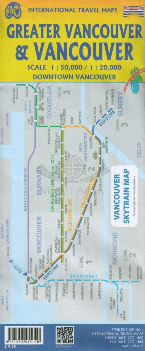Składany, wodoodporny plan miasta Vancouver w skali 1:20 000 oraz metropolii Greater Vancouver w skali 1:50 000 wydawnictwa ITMB.