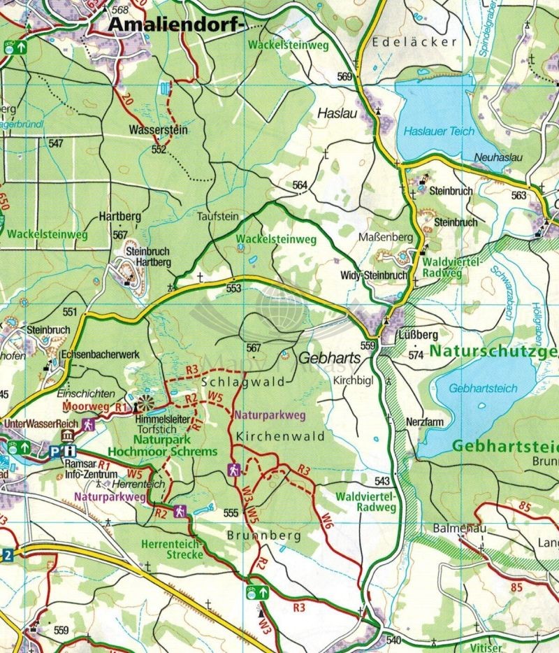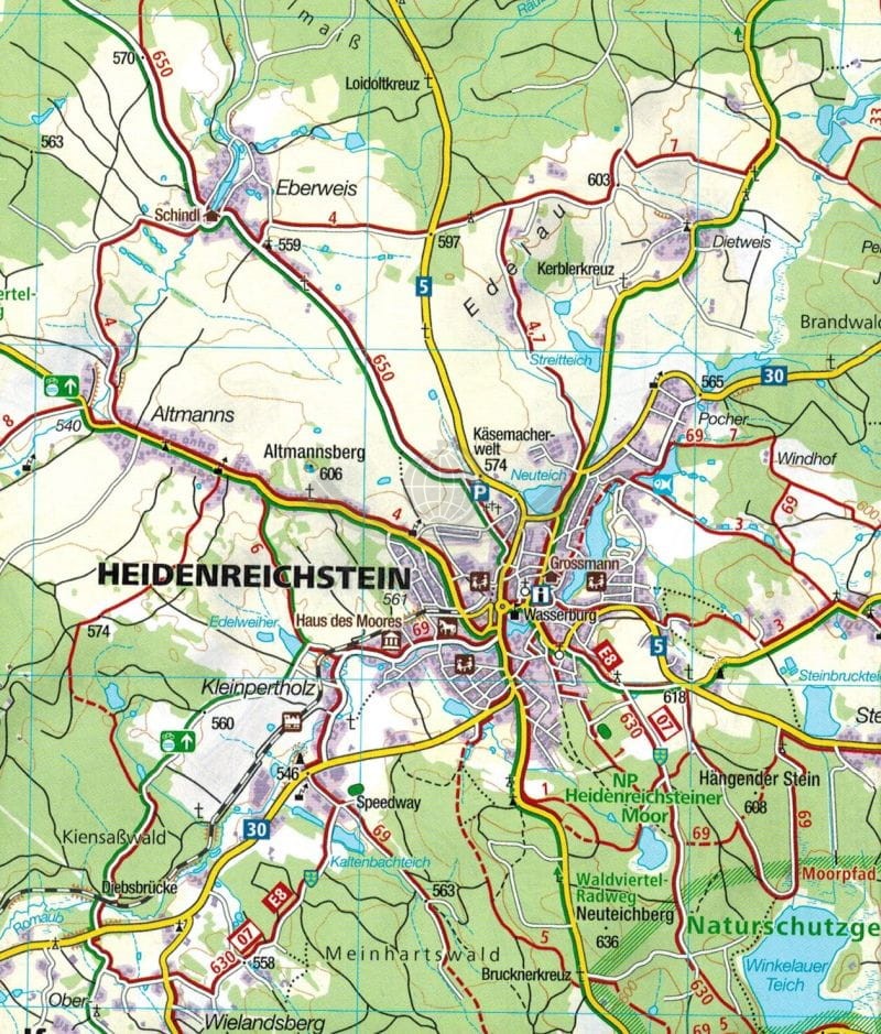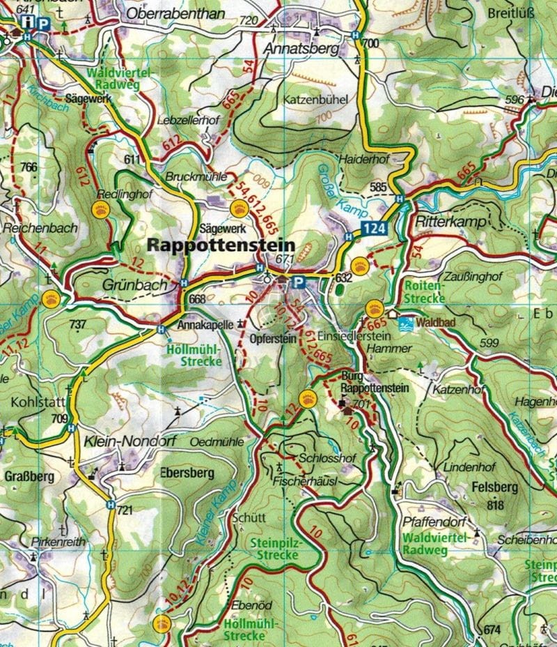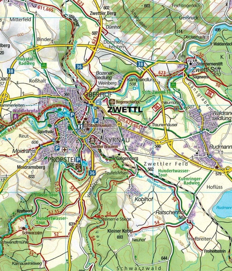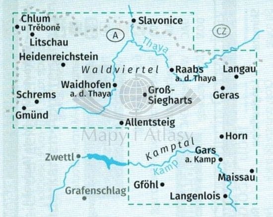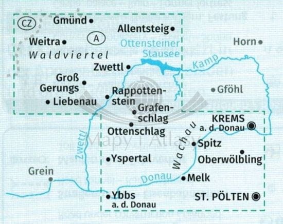 Mapa obejmuje swym zasięgiem miasta: Litschau, Raabs a.d. Thaya, Schrems, Waidhofen a.d. Thaya, Langau, Nove Hrady, Gmund, Horn, Karlstift, Zwettl, Gross Gerungs, Grafenschlag, Krems a.d. Donau, Langenlois, Spitz, Yspertal, St. Polten, Ybbs, Melk.
