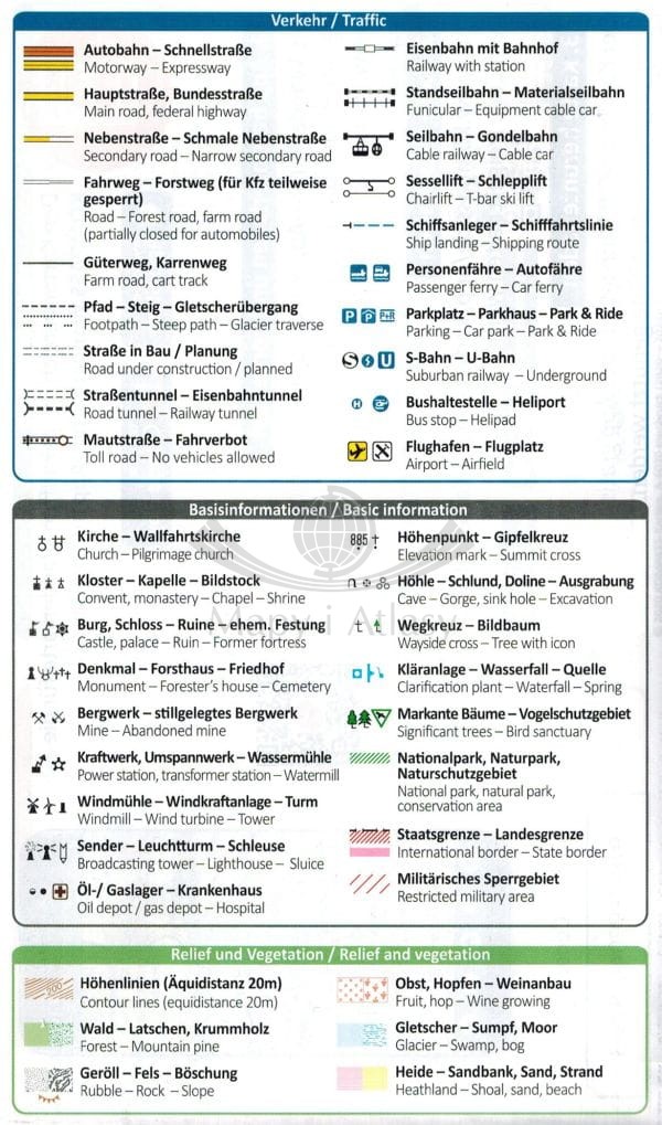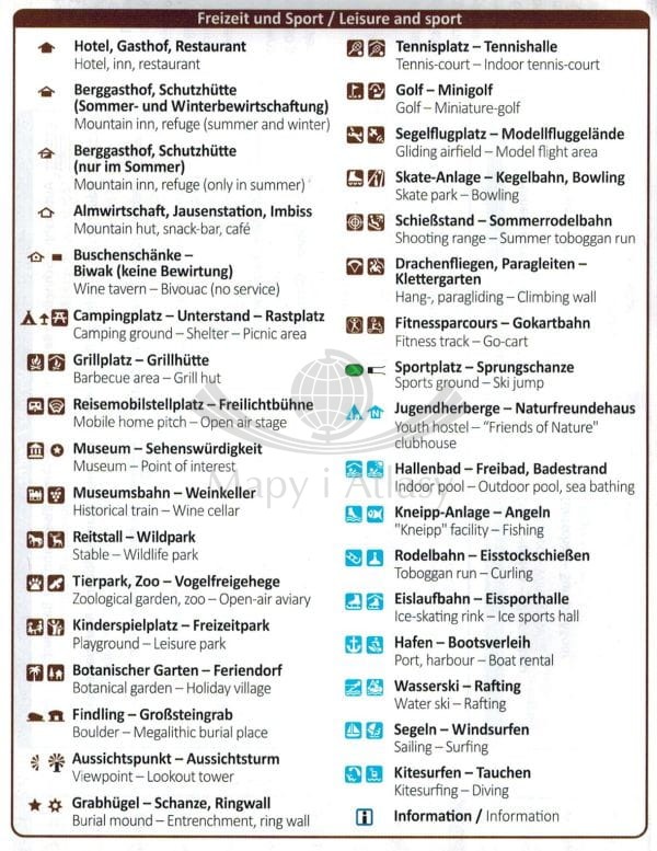 Zestaw dwóch składanych, dwustronnych map turystycznych Waldviertel, Kamptal, Wachau w skali 1:50 000. Na mapach zaznaczono m.in.: sieć dróg i autostrad wraz z numerami, linie kolejowe ze stacjami, tunele, lotniska, parkingi, przystanki autobusowe...