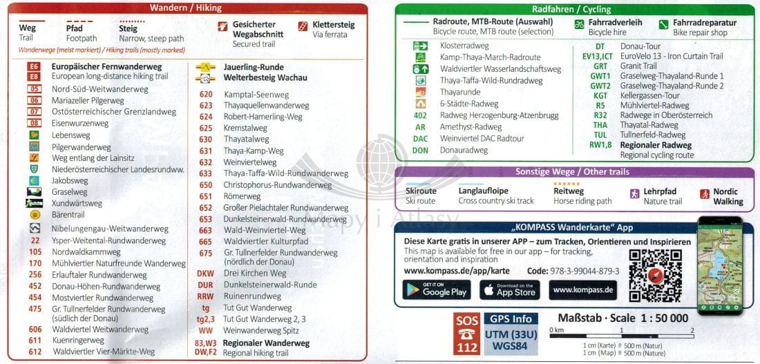 Zestaw dwóch składanych, dwustronnych map turystycznych Waldviertel, Kamptal, Wachau w skali 1:50 000. Legenda w języku angielskim i niemieckim.
