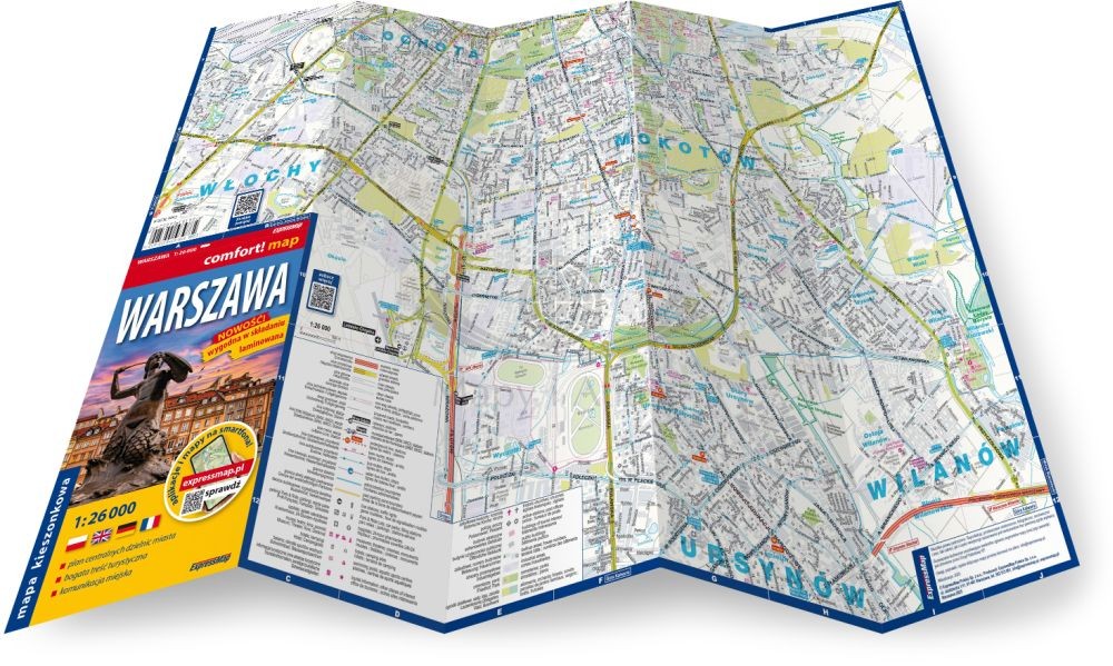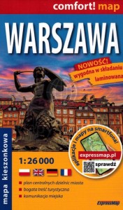 Składana, dwustronna, laminowana mapa kieszonkowa centralnych dzielnic Warszawy w skali 1:26 000 wydawnictwa ExpressMap.