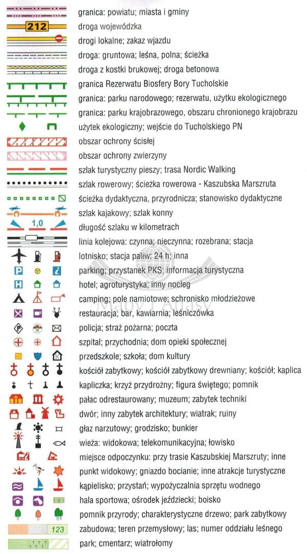 Na mapie zaznaczono przebieg szlaków pieszych, rowerowych, konnych i kajakowych z kilometrażem, a także położenie punktów noclegowych i gastronomicznych. Dodatkowo mapa zawiera informacje o przebiegu szlaków Kaszubskiej Marszruty.