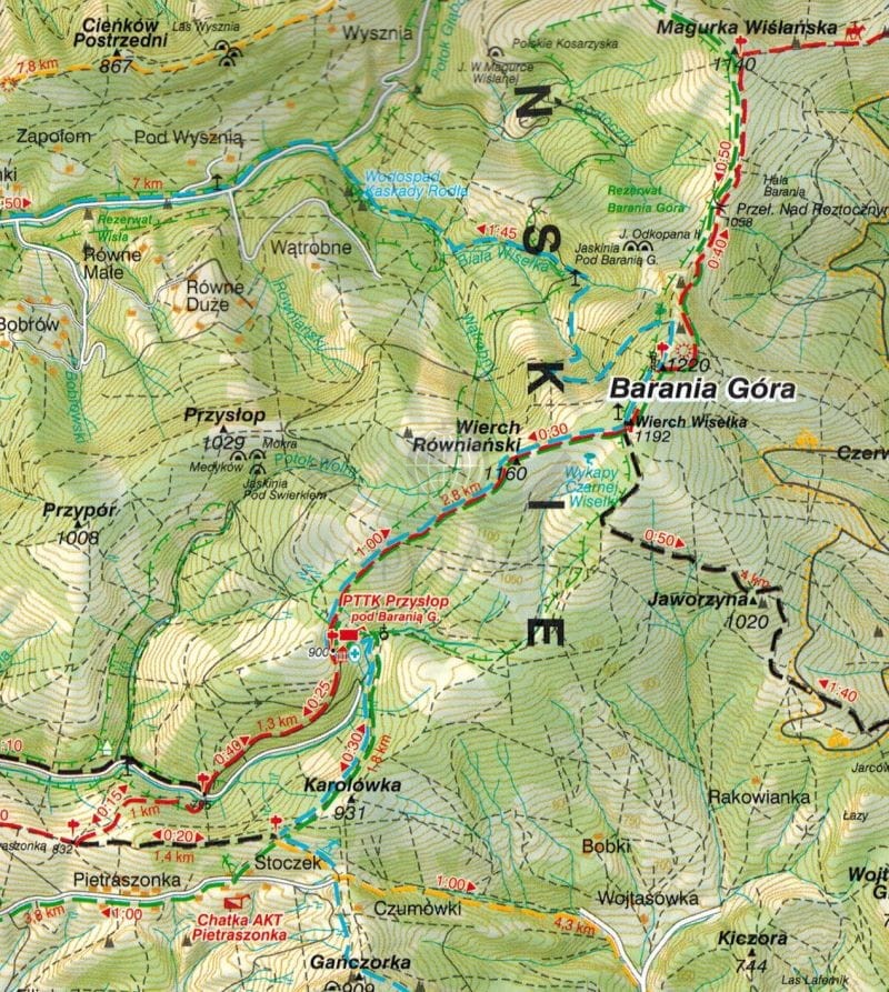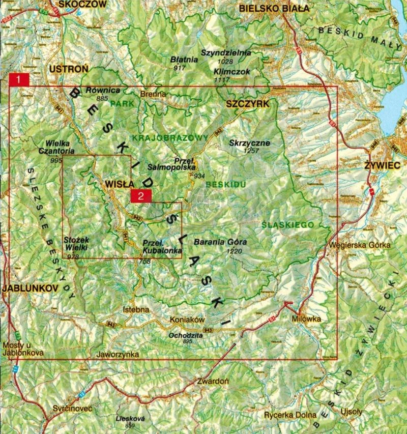 Na jednej stronie arkusza znajduje się mapa okolic Wisły w skali 1:50 000 z zaznaczonymi szlakami o charakterze lokalnym, szlaki narciarskie, rowerowe, konne. Granica mapy sięga od Ustronia i Szczyrku na północy, do Jaworzynki i Dolnej Rajczy na południu, po Bystrzycę (Czechy) na zachodzie i Węgierską Górkę, Milówkę na wschodzie.